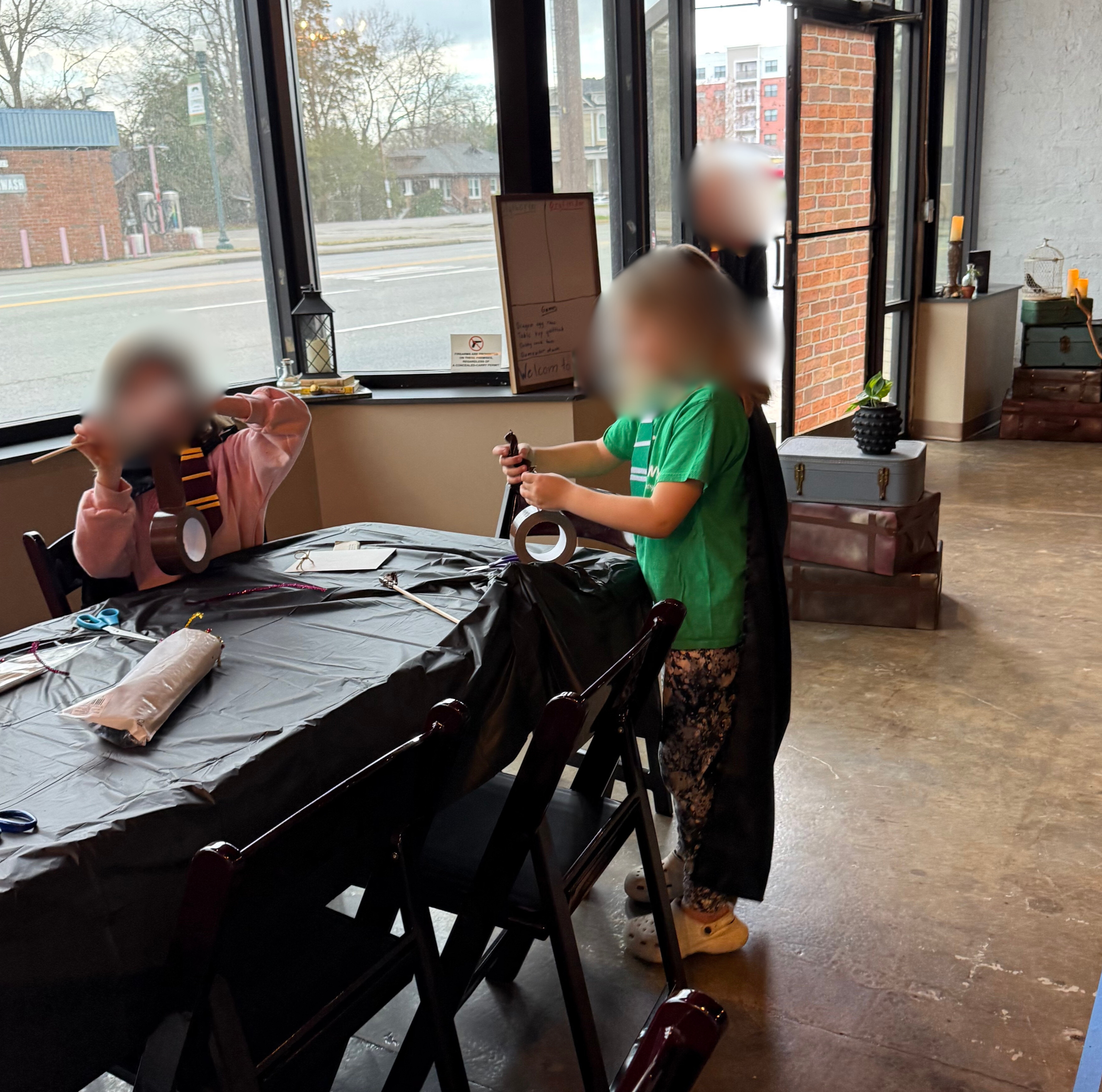 Instead of jumping straight into games, the children first stopped by the wand shop where they made their own wands using dowels, pipe cleaners, and brown duct tape. This small detail gave them something hands-on and immediately pulled them into the theme.